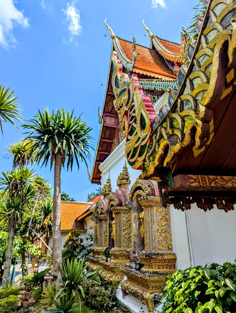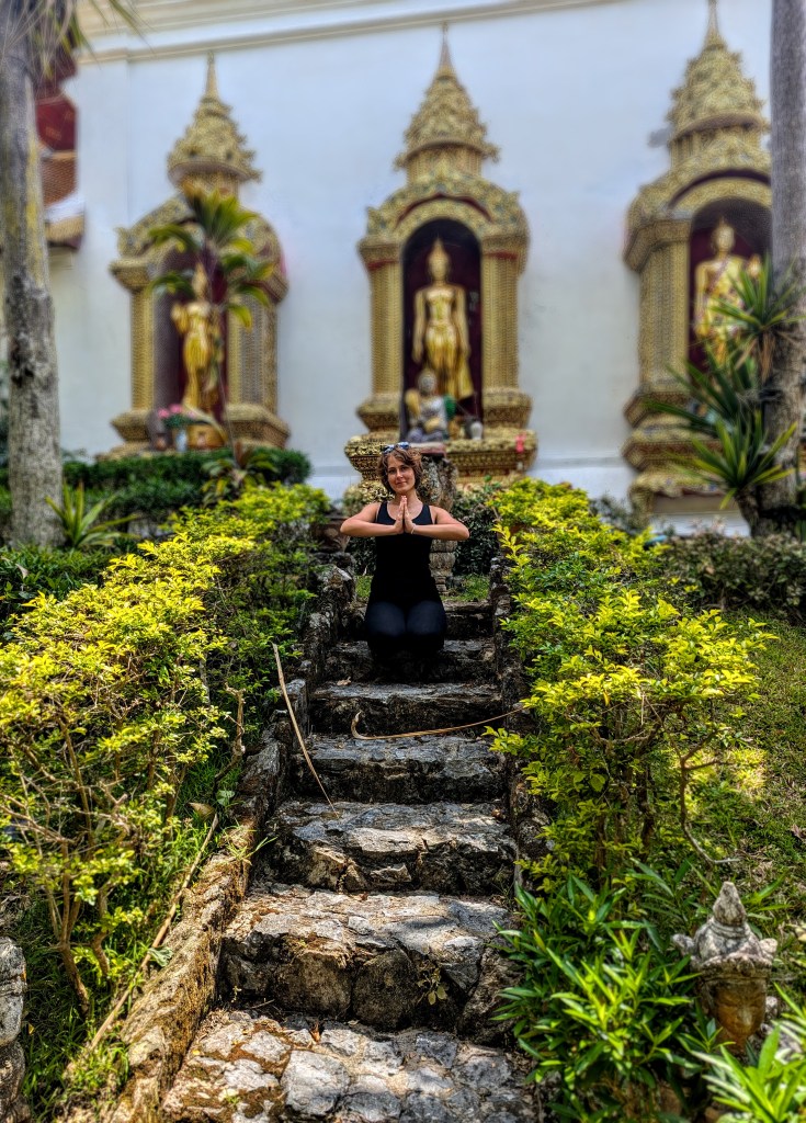 We decided to leave, when the driver, in an attempt to still get his income, offered us a deal for 200 bhat each two ways. We agreed and were taken up the mountain, to see a gorgeous golden temple looking down on the city of Chiang Mai. For a small gratitude, the smiley monk in orange robe and glasses read a mantra for luck and happiness over me, dripping the holy water from a wooden brush. He then tied a white thread over my left hand.