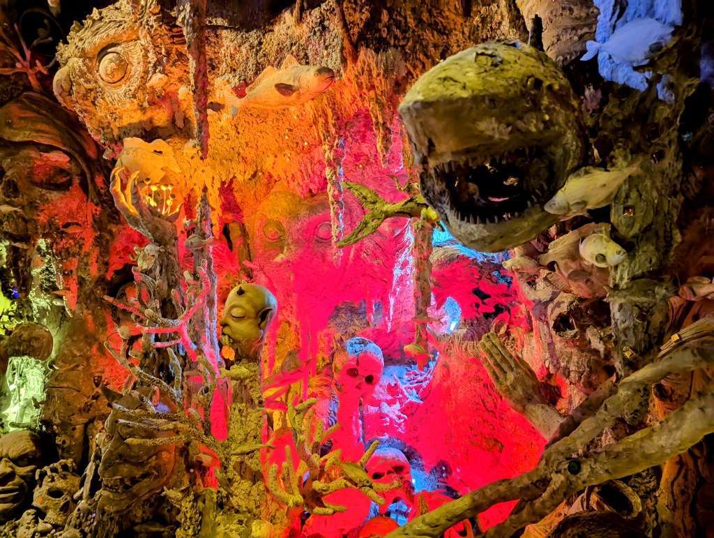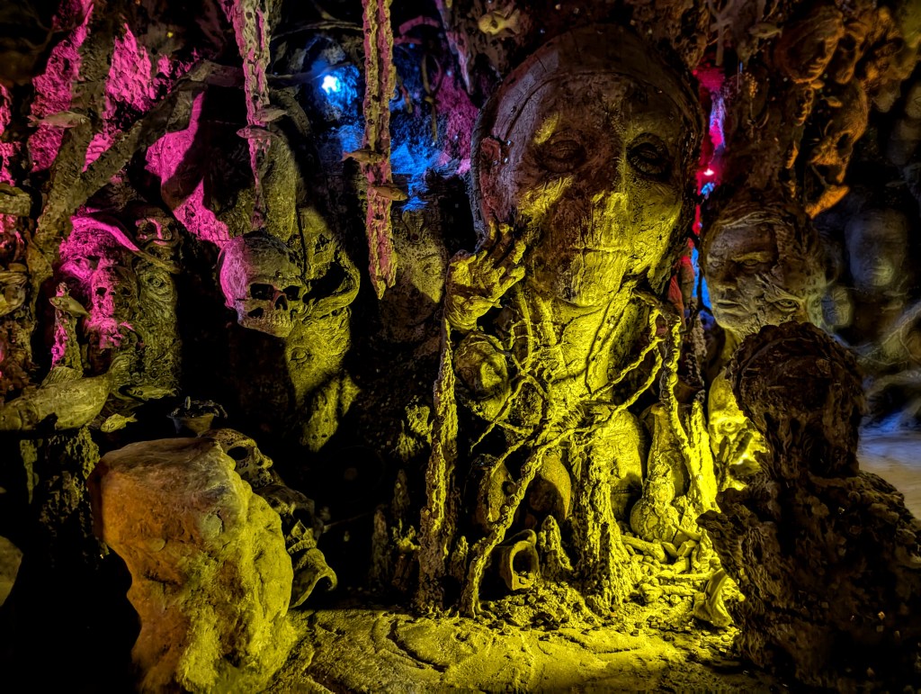 To add on, they also created an even more sinister cave with haunting music, which depicted horror stories from the underwater world. Terrifying stone-engraved creatures, skulls, daggers, fish, etc.