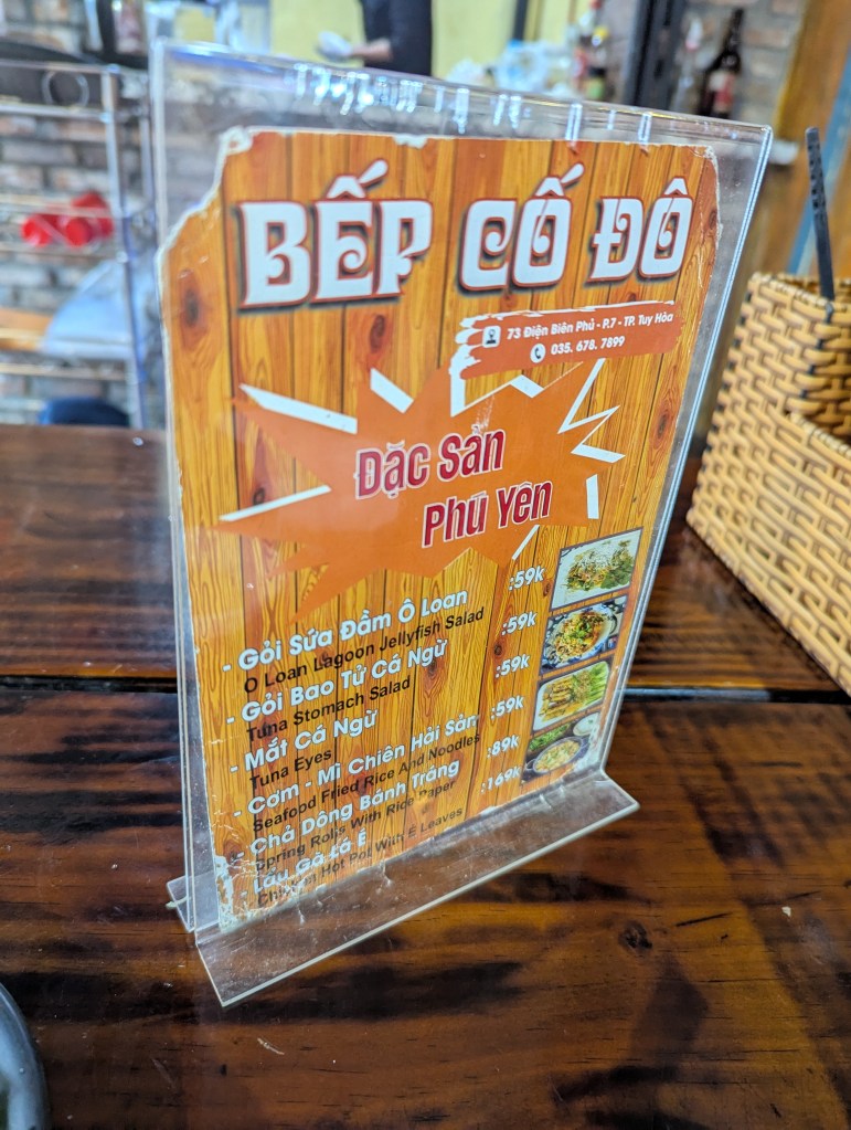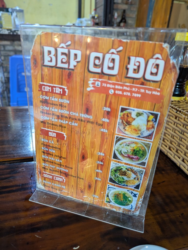 Food also varies by place but of course, still much cheaper than, say, in Toronto. Below you can see the menu of a small family restaurant with some fair pricing. As you can see, I ordered a fish noodle soup for 40,000 dong, or 2.25$. The noodle soup came with small plate of sprouted beans, and had a small squid, some moving tentacles, egg, shrimp, and pieces of fish. Not too bad, huh?