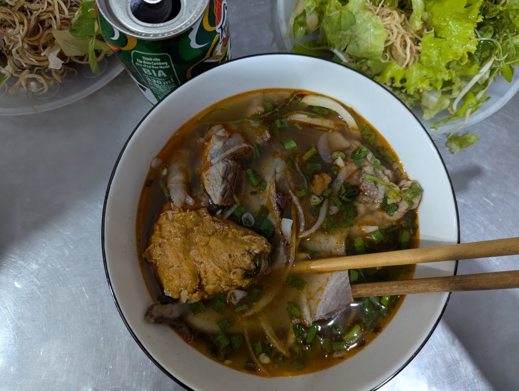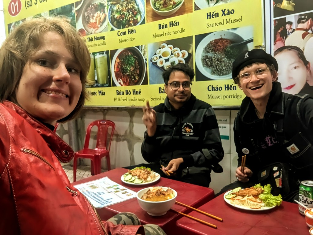 On our first day we did not plan much, and ended up passing by at least 5 restaurants, moaning about how hungry we are in the meantime. Finally sitting down at one of them, we ordered some Vietnamese soup (bahn beo hue, maybe??) with a bahn mi (Vietnamese “subway” sandwich; to all Vietnamese reading this, please do not throw rotten durian at me for this comparison). After having a chat and exchanging favorite songs on Mate’s speaker, Dju went back to the hostel, and me and Mate took a bicycle cart (or whatever its called) to the DMZ bar around the corner, effectively bringing down the ride price from 150,000 dong to just 50,000.