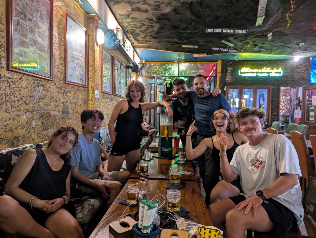 It was terribly hot, and we stopped at the cool KFC to eat and play UNO with a sweet girl named Sophia from the UK, who did medicine in one of the schools there. Since it was Dju’s BD the next day, we got some other folks from the hotel, including Kevin and Bobby, who travelled together on motorbikes, back to the DMZ bar. A couple of other folks joined, for example their friends Vanessa and Annika.
