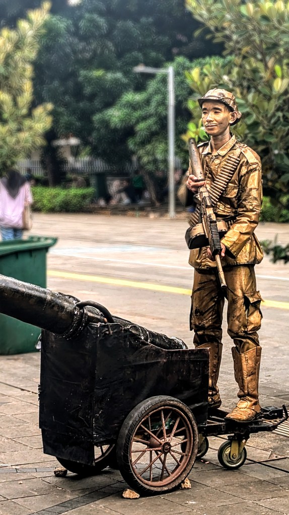 We passed by the square, were the street performers dressed as Dutch ladies or pure gold-covered soldiers were posing for pictures, and reached the small lookout point onto the canal. It contained a meter stick – 4-meter-high monument signifying how Jakarta is sinking 20 cm every year. Considering its also prone to earthquakes, the government made a decision to move the capital to the new city currently under construction in Borneo, in the area much safer and at a higher altitude.