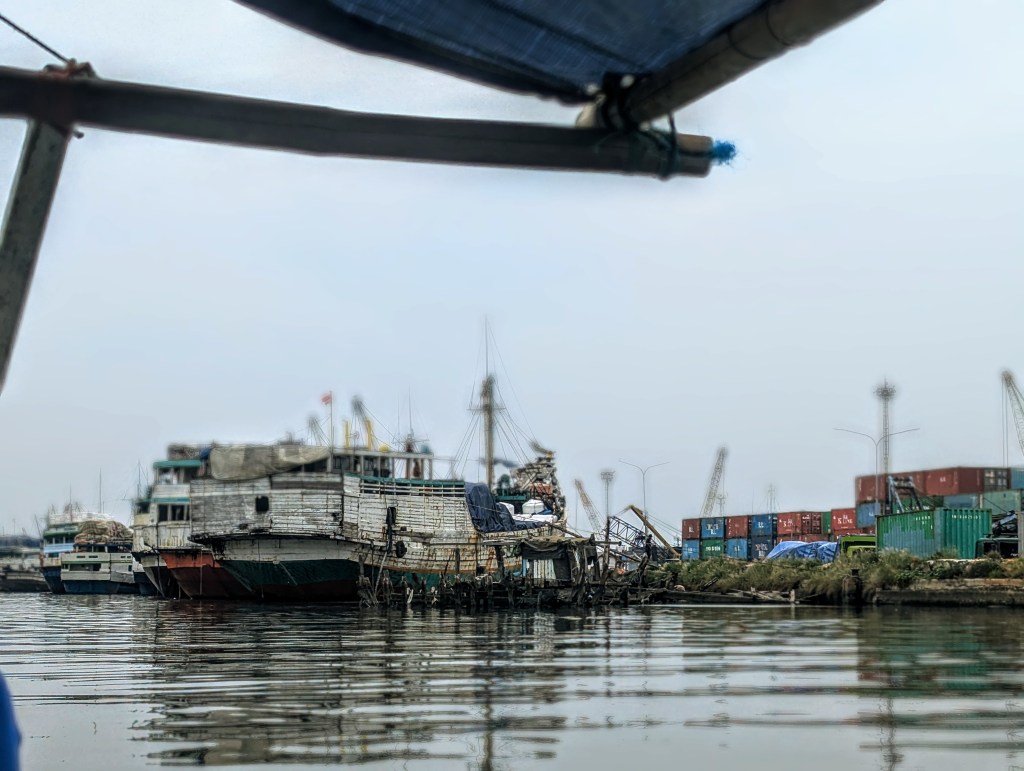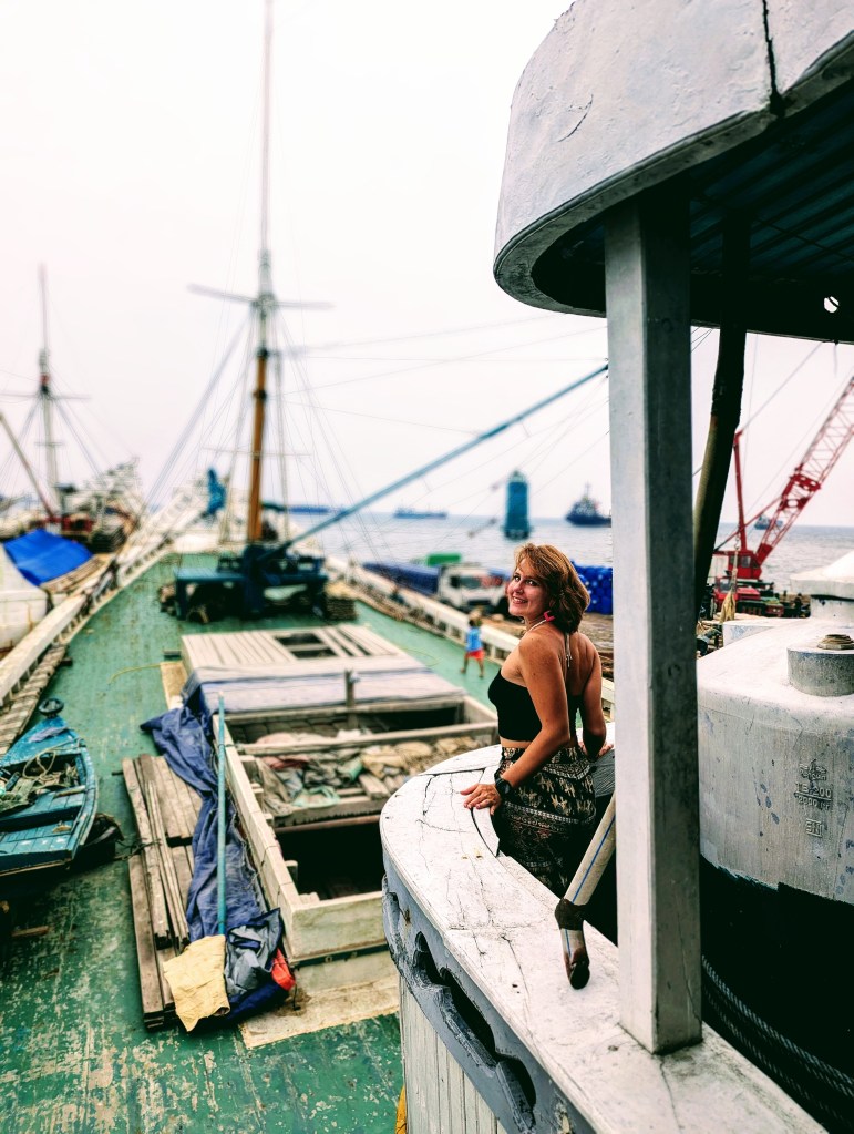 One of the good things about these tours is that they are also led by locals – and that means they take us to places we might not otherwise ever go as solo travellers, because these places are SO local. Like the harbour we visited, where the ships transport goods from Jakarta to the Indonesian Thousand Islands, and back. Yes, Indonesia has Thousand Islands, too! We literally climbed the ship over the board, then up the not-so-friendly stairs on the very top, ending up somewhere like 20 minutes above greyish water of the harbour. The ship carries cement, by the way. Our hands were all dusty.