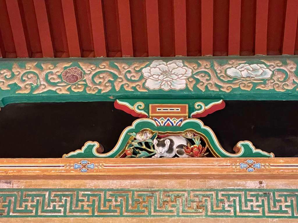 One of the shrines had an arch that led to the interior outdoor space. The arch was decorated by a sleeping cat (Nemurineko), with closed eyes but paws held tight and head looking straight. The cat symbolized country, which is in peace but is ready to fight and defend if needed.