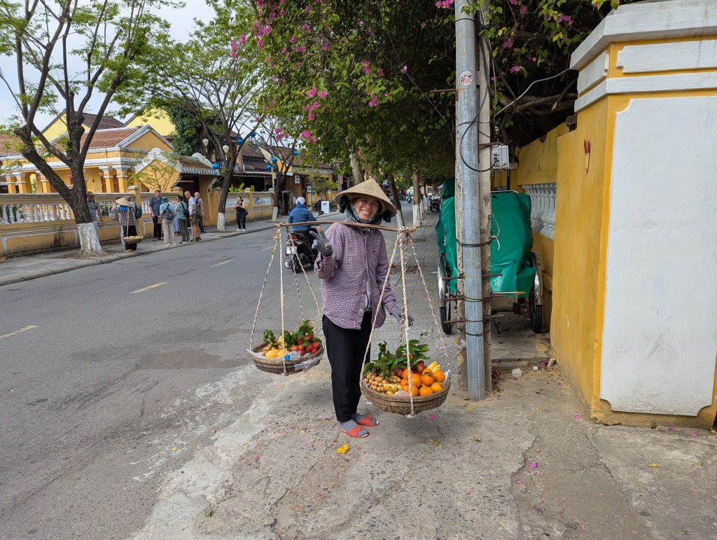 As if the taxi scam was not enough, I decided it would be fun to get myself into another one. I saw the woman with traditional over-shoulder fruit baskets, and when she offered to take the picture I knew where it was going – but the pictures would indeed be so nice that I thought I would go for it. She gave me the basket to hold and after a small photo session offered to buy her fruits, even cut some for me to try. To be fair, the fruits were AMAZING. She filled my whole bag with them, and I would have gladly taken them all, but was not ready to pay that big amount of many she wanted. Next ten minutes we spent negotiating, with me mostly putting my fruits back into her basket, and her trying to return them back into my bag. The answer to the math problem “How many mangoes does Sofia have if the Vietnamese lady gave her 6” is 1. I bought 1 mango for 50,000 dong LMAO (6 mangoes for that price would be more fair, or at least three).