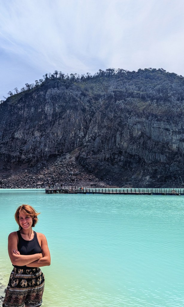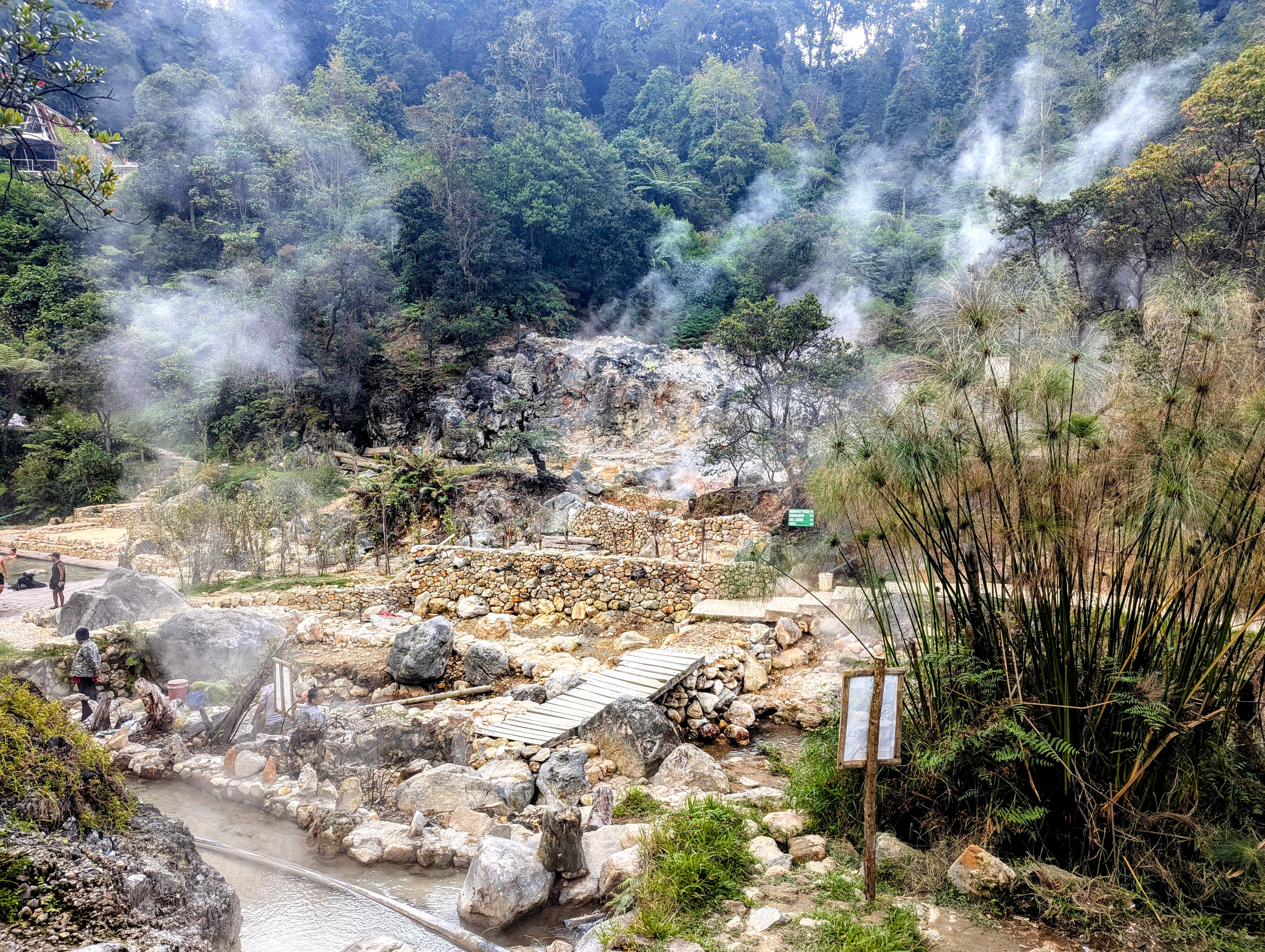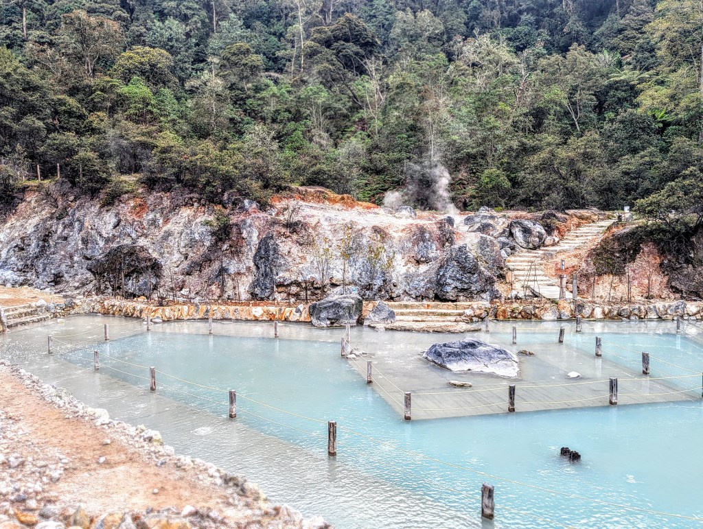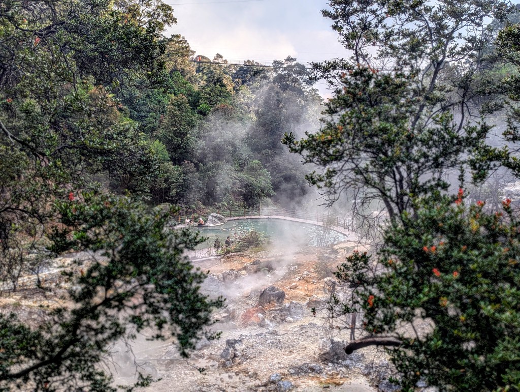 We also visited the hot springs at Cibuni Rengganis Crater – less of the smell, and definitely more life. Clean hot water of different temperatures across several basins, and a small waterfall where you could swim and relax. Google Maps tricked us into going along a very picturesque tea field road which was just pure cobblestone and needed something more serious than two leisure scooters. Especially for the rider at the back (me), it felt even bumpier and scarier, to the point when we just stopped on the spot of the even surface and giggled hysterically, before continuing our way. It turned out we had to enter from a totally different side, where we would also get a ticket to enter the zipline and the bridge over the abyss, which connected the two sides of the hot spring valley.