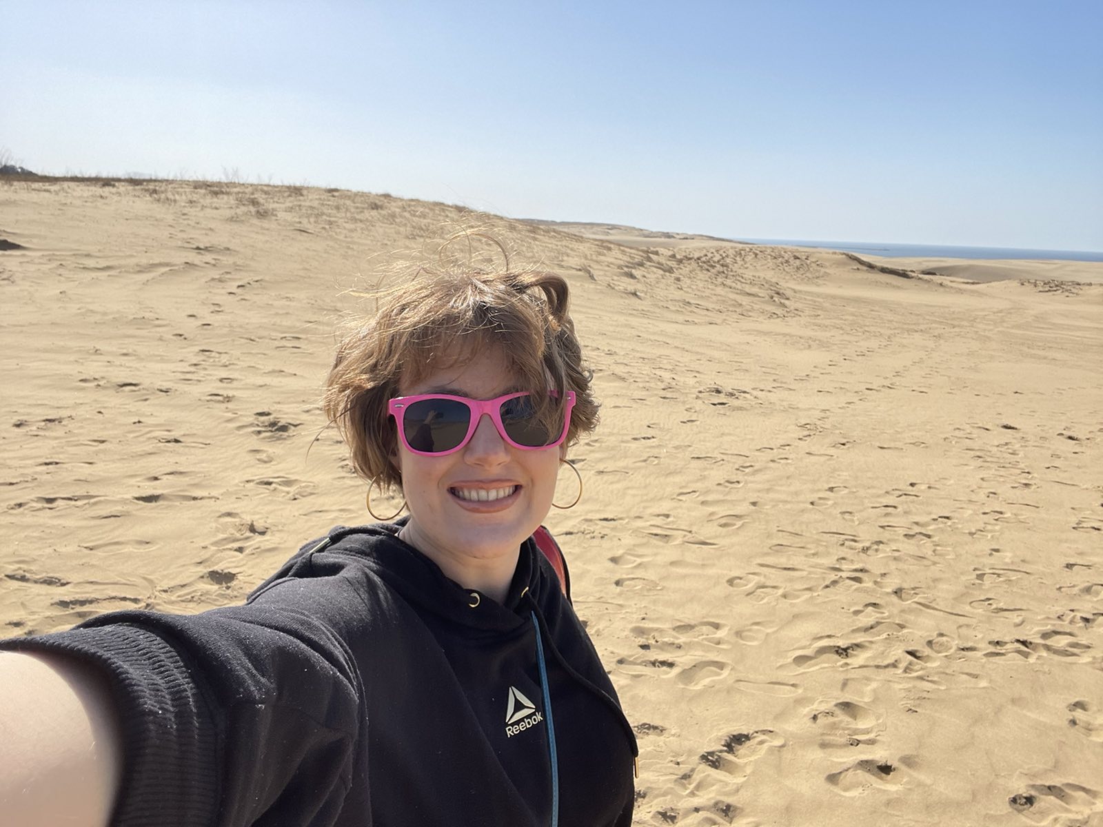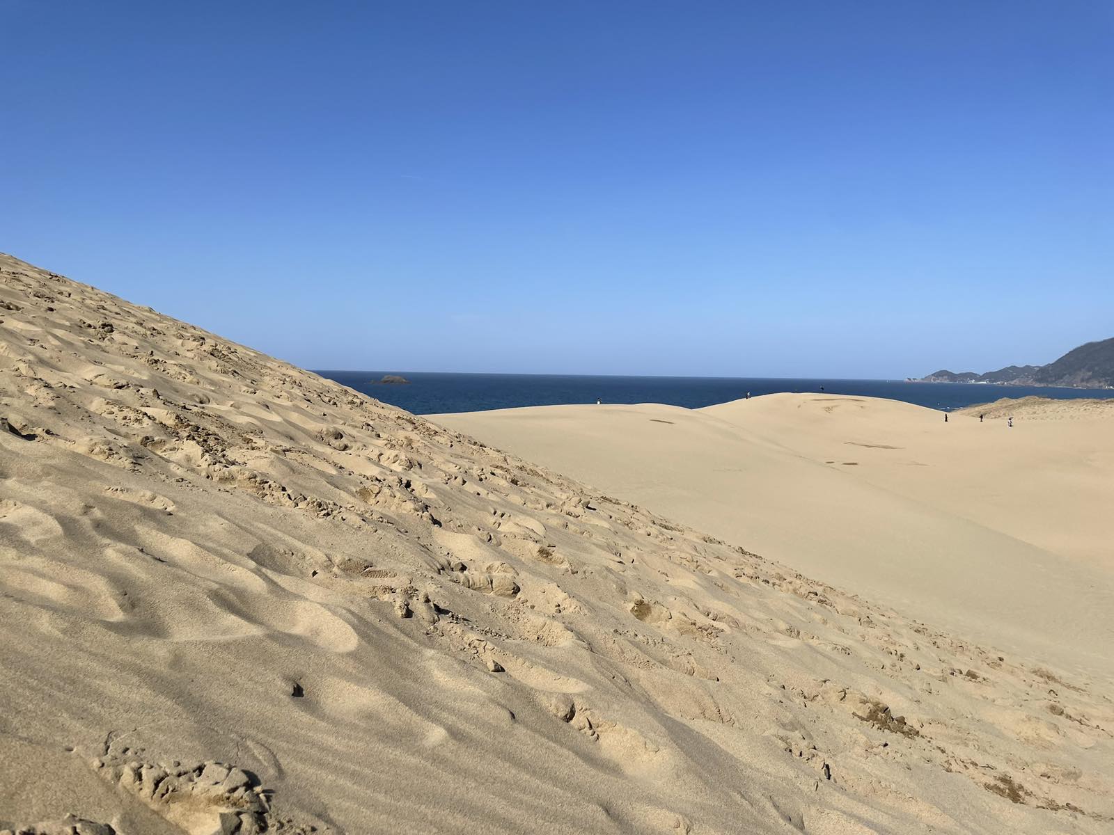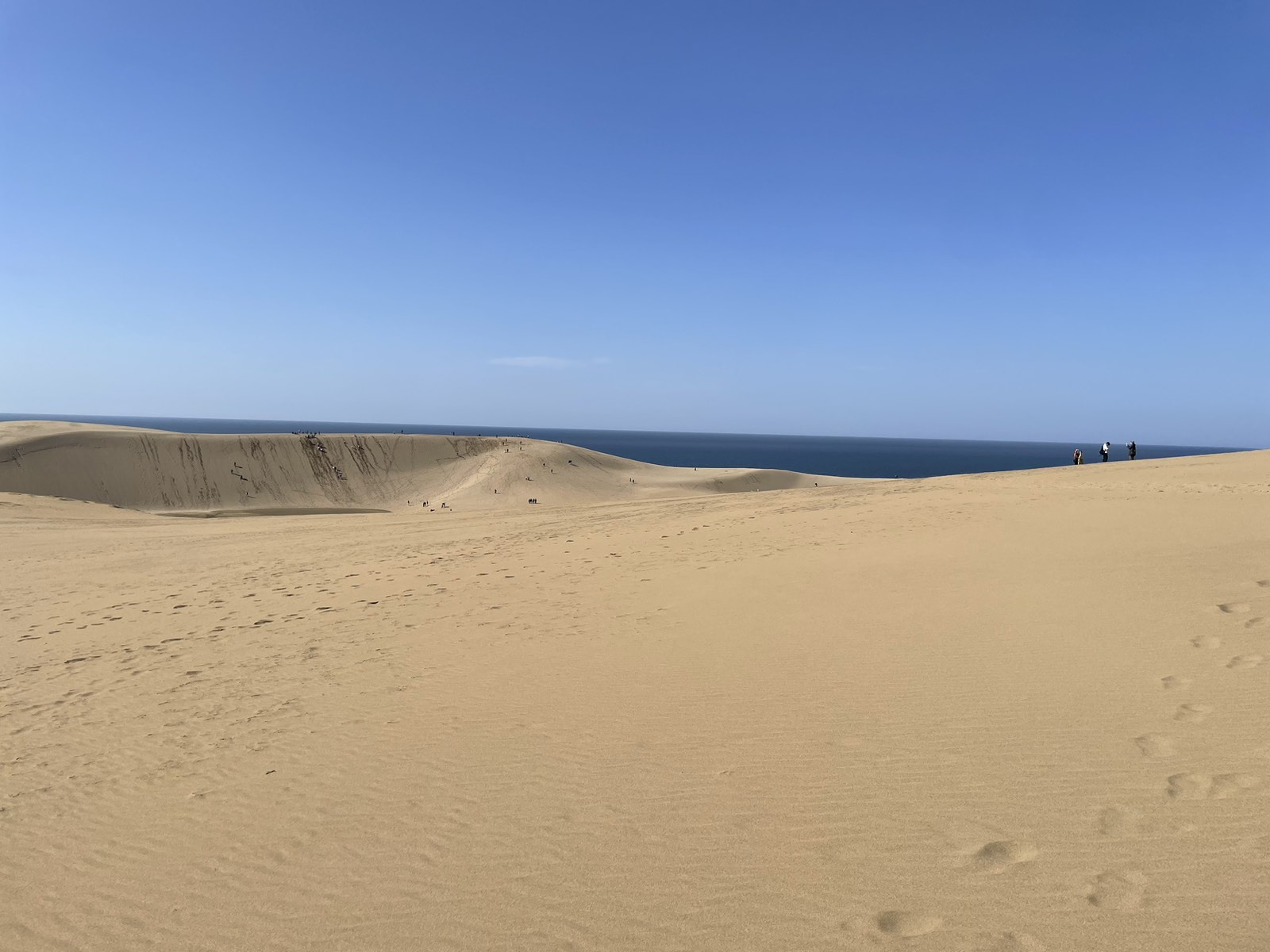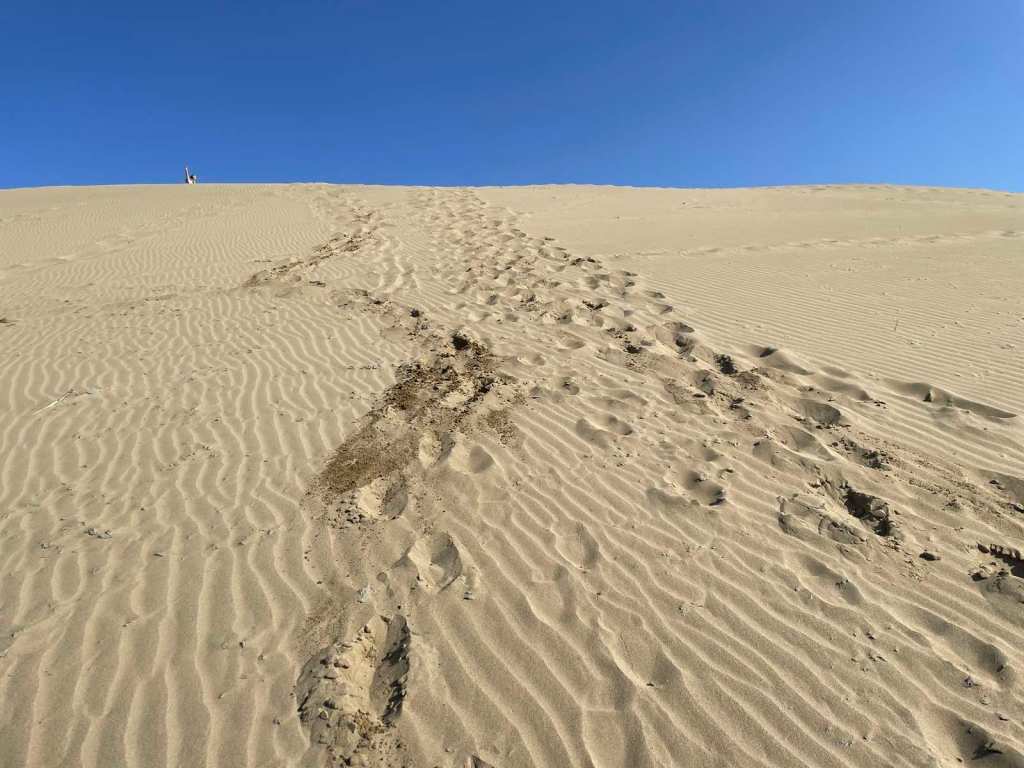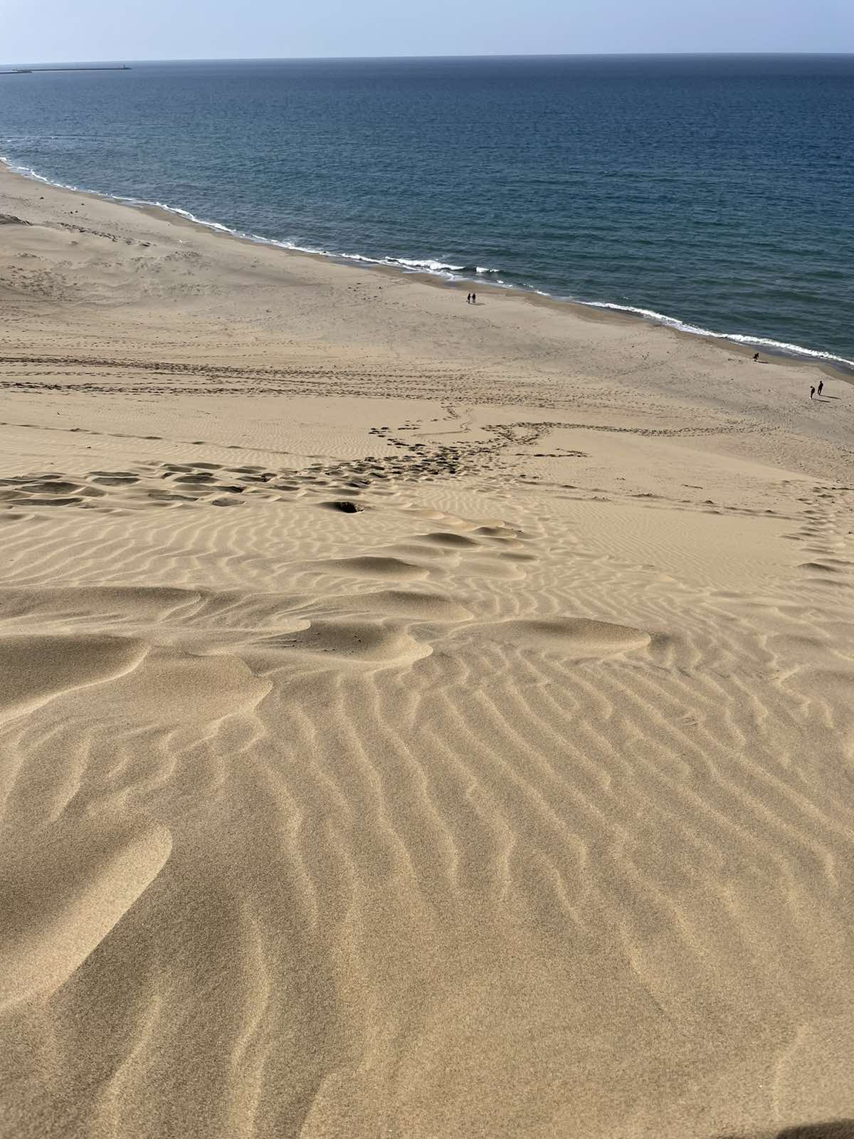 Tottori sand dunes do resemble a desert, at least at the part where the shoreline is very wide and goes far into the land. There are high dunes which would require quite a bit of cardio to climb up, and just a little bit of recklessness to fall down and drag other unfortunate folks after you.